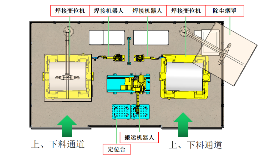 工作站包含雙工位,由兩臺(tái)焊接機(jī)器人分別對(duì)應(yīng)每個(gè)工位的焊接任務(wù)。焊接的是兩種產(chǎn)品,搬運(yùn)機(jī)器人負(fù)責(zé)自動(dòng)拼點(diǎn)任務(wù)。