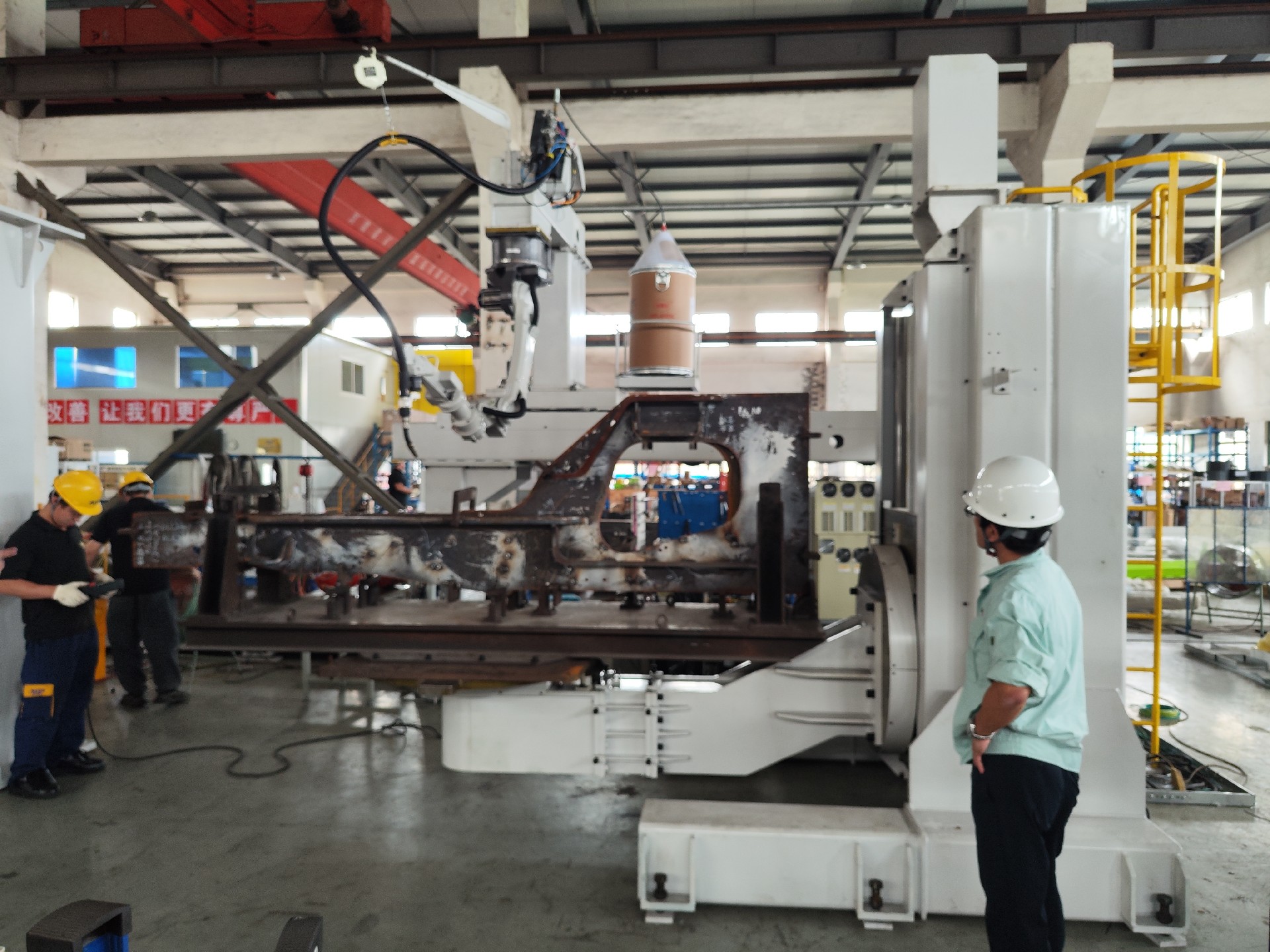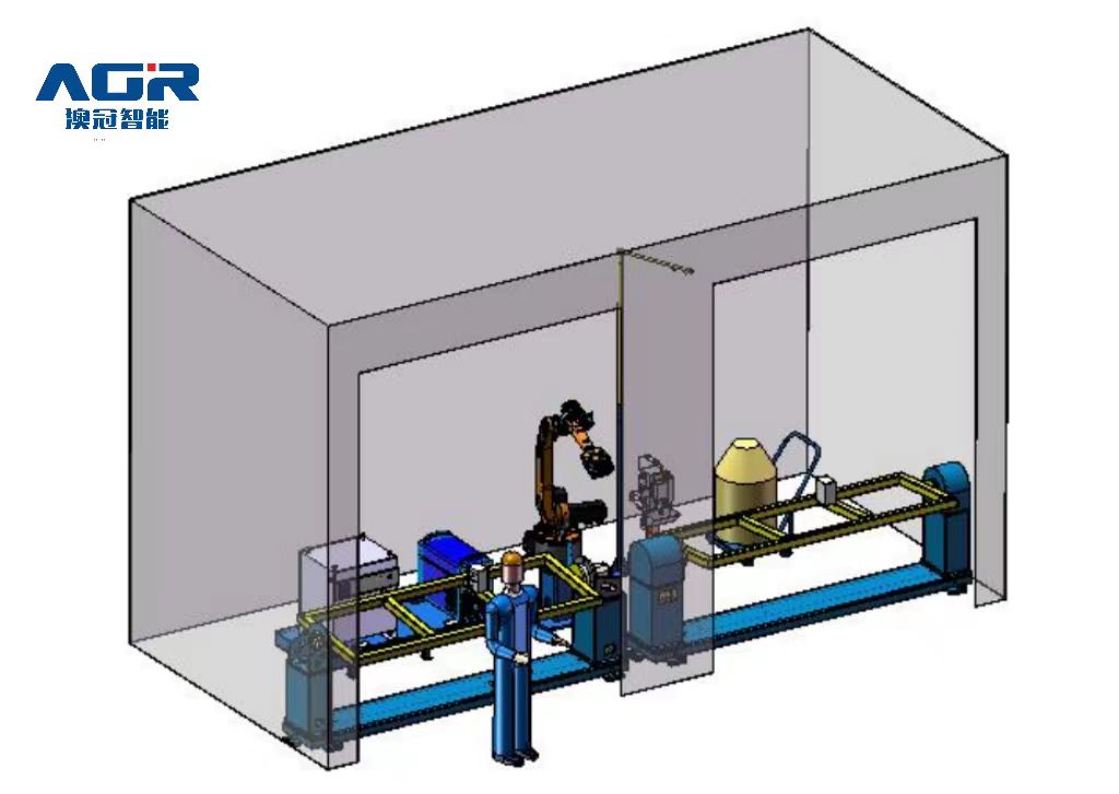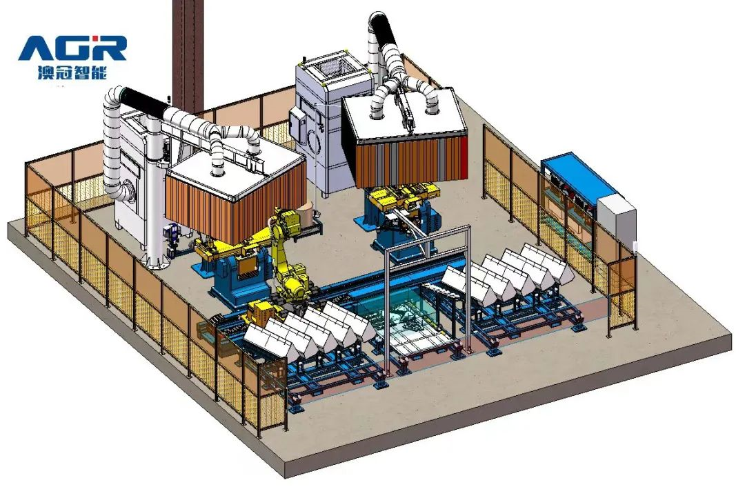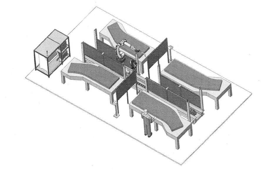 5機(jī)聯(lián)動(dòng)機(jī)器人焊接系統(tǒng);變位機(jī)承載能力達(dá)到1噸,適用于多型號(hào)動(dòng)臂斗桿結(jié)構(gòu)件的焊接;反變形及夾緊定位一體化設(shè)計(jì)伺服夾具,與工件自 動(dòng)化柔性輸送系統(tǒng)配合,可實(shí)現(xiàn)多種型號(hào)工件的自動(dòng)裝夾。